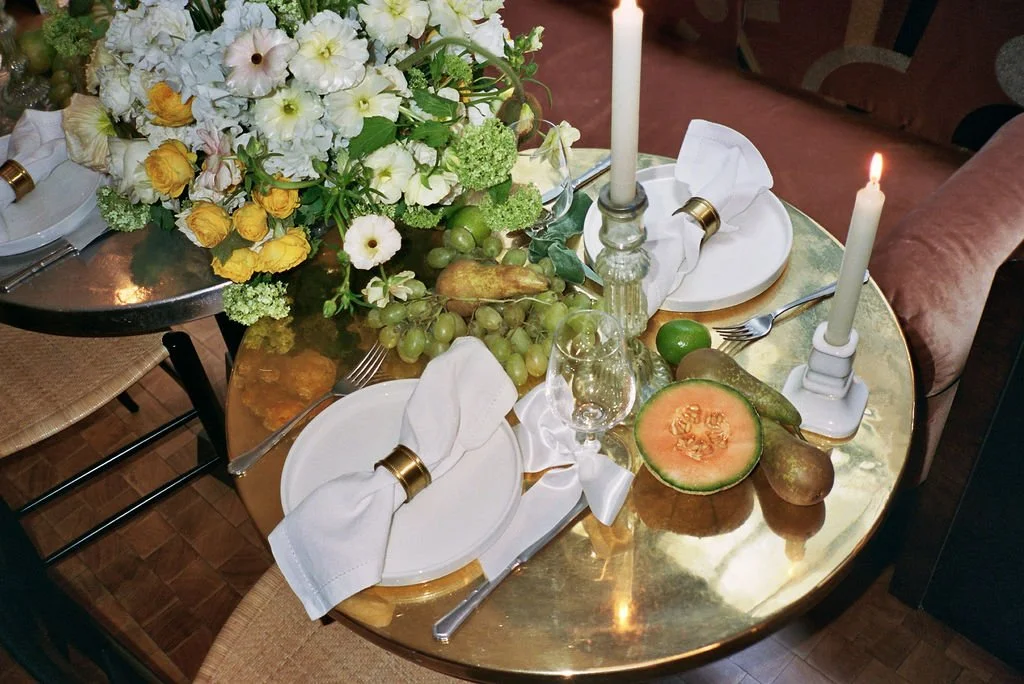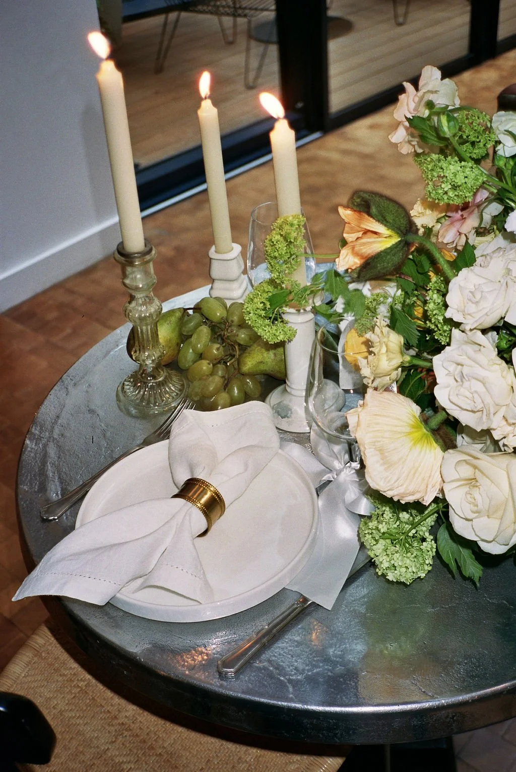 Décoration chinée, bougeoirs et vaisselle dépareillée, fleurs et fruits pour habiller.